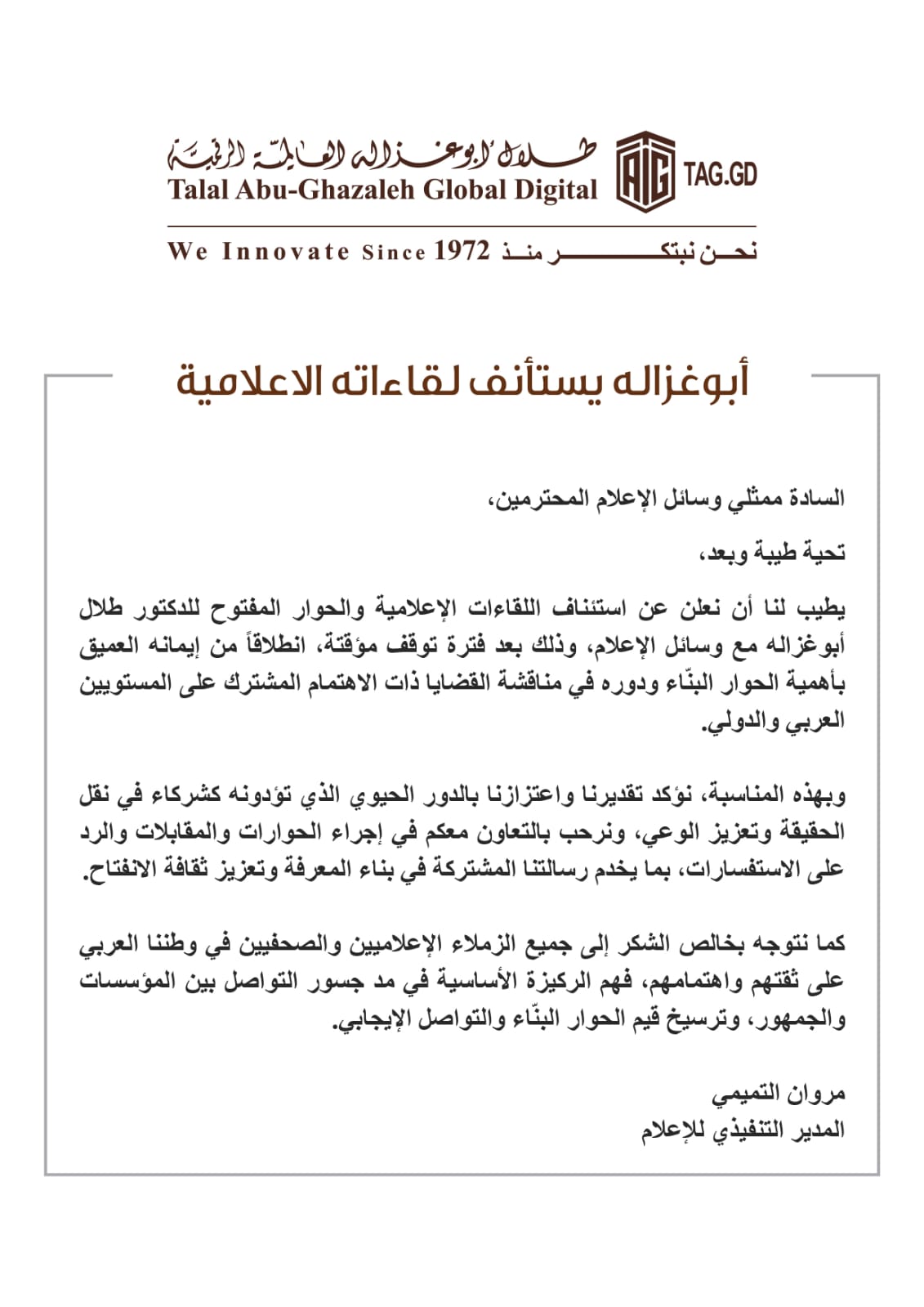 يطيب لنا أن نعلن عن استئناف اللقاءات الإعلامية والحوار المفتوح للدكتور طلال أبوغزاله مع وسائل الإعلام، وذلك بعد فترة توقف مؤقتة، انطلاقاً من إيمانه العميق بأهمية الحوار البنّاء ودوره في مناقشة القضايا ذات الاهتمام المشترك على المستويين العربي والدولي.